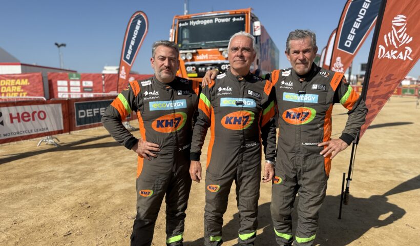 Jordi Juvanteny, José Luis Criado y Xavier Ribas completan los primeros kilómetros del rally al volante del primer camión híbrido de hidrógeno y eléctrico de…